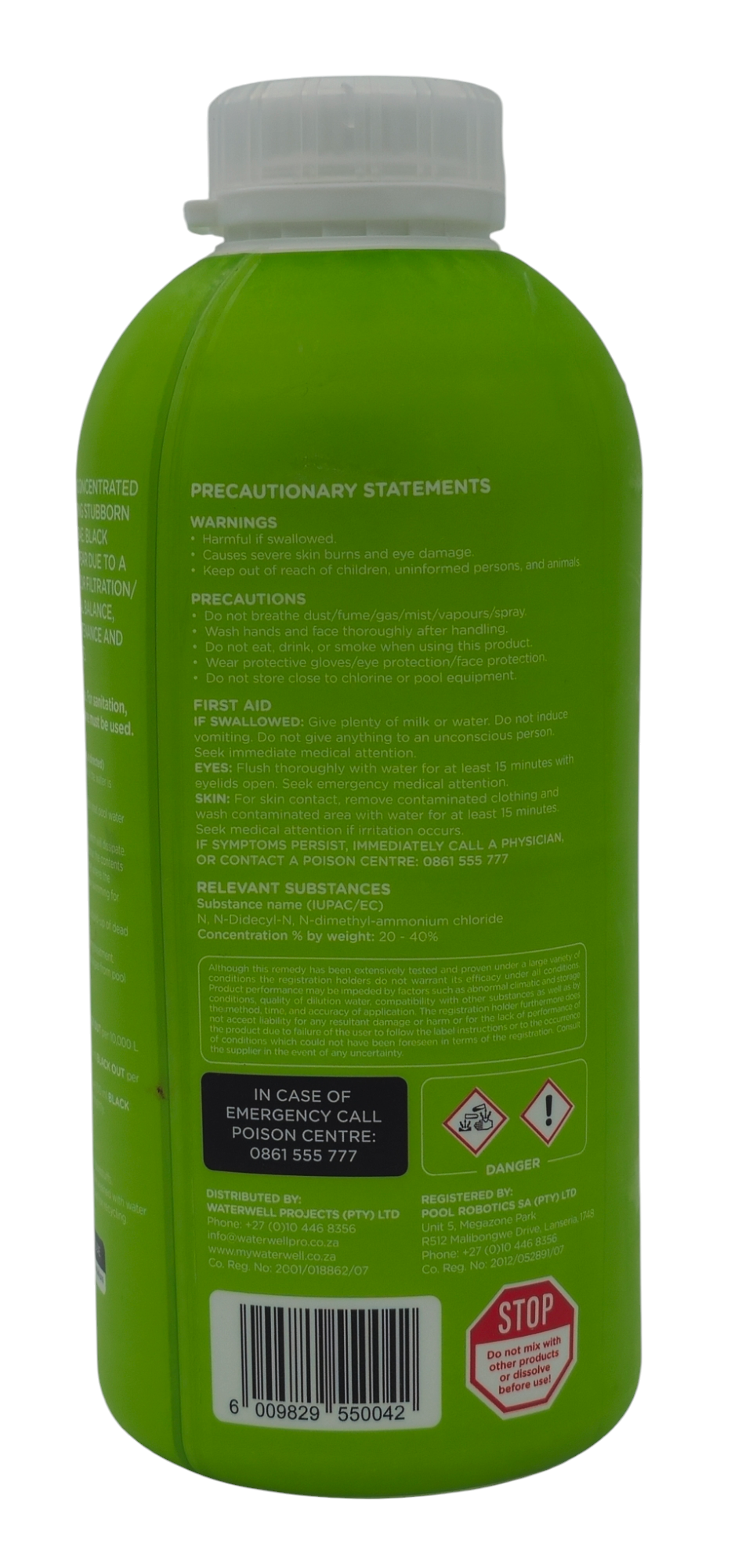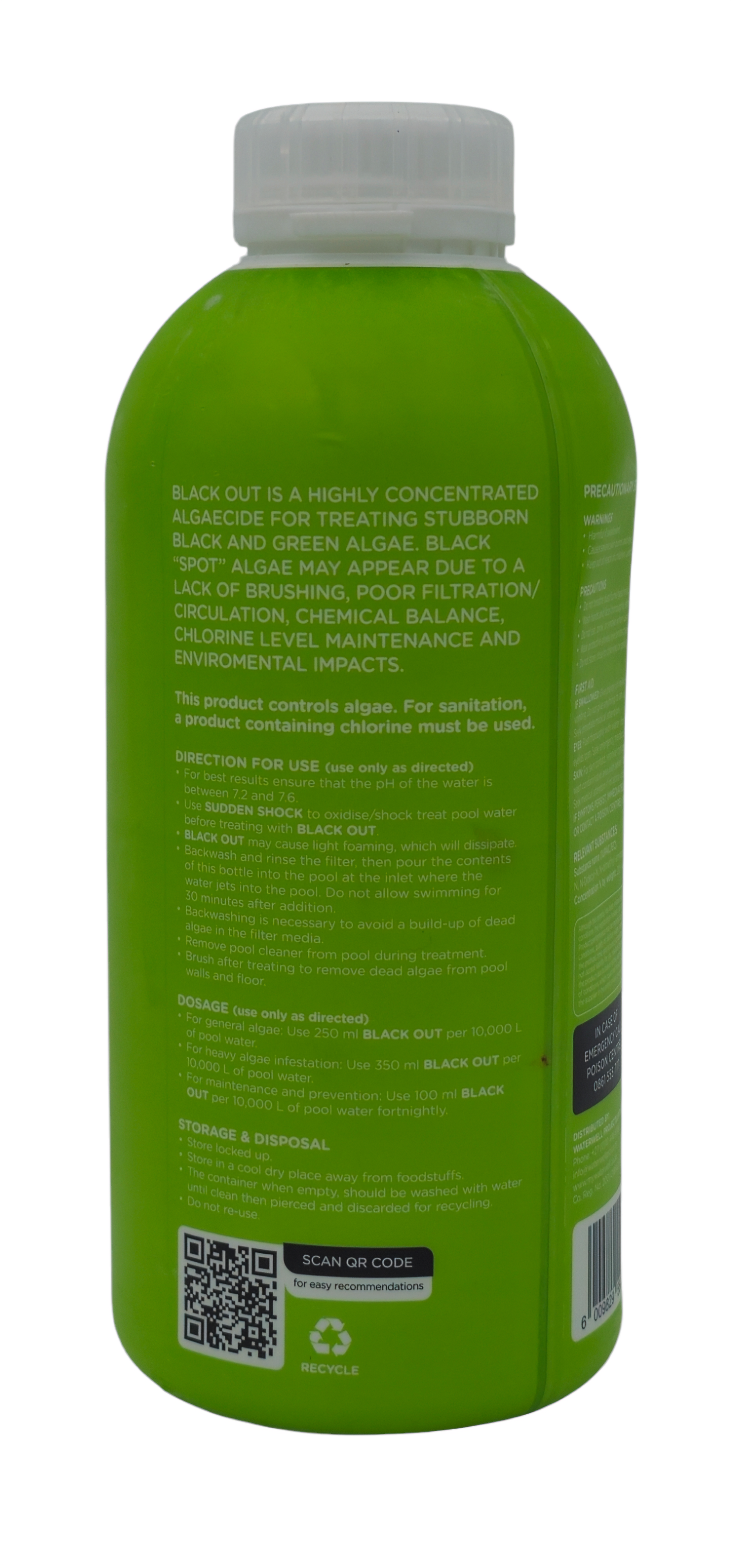 Black Out is a highly concentrated algaecide for treatment against stubborn algae. "Black spot" algae appear when a pool has been neglected i.e. inefficient filtration and circulation, pH testing and/or chlorine levels have not been maintained regularly.